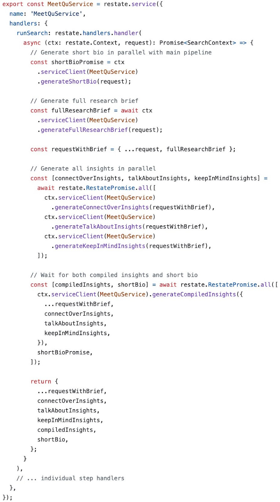 At Pond, we use Restate for MeetQu, our AI-powered meeting preparation tool. Our pipeline processes LinkedIn profiles and generates personalised insights through a 6-step process involving multiple LLM calls and Google searches. Here's how we structure it: