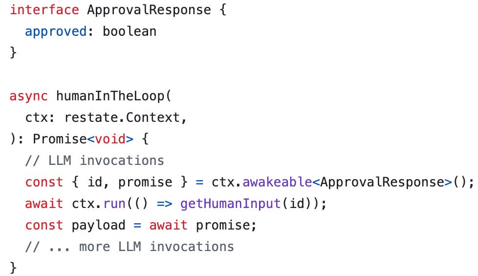 For human-in-the-loop scenarios, Restate's awakeables provide a clean alternative to LangGraph's interrupts: